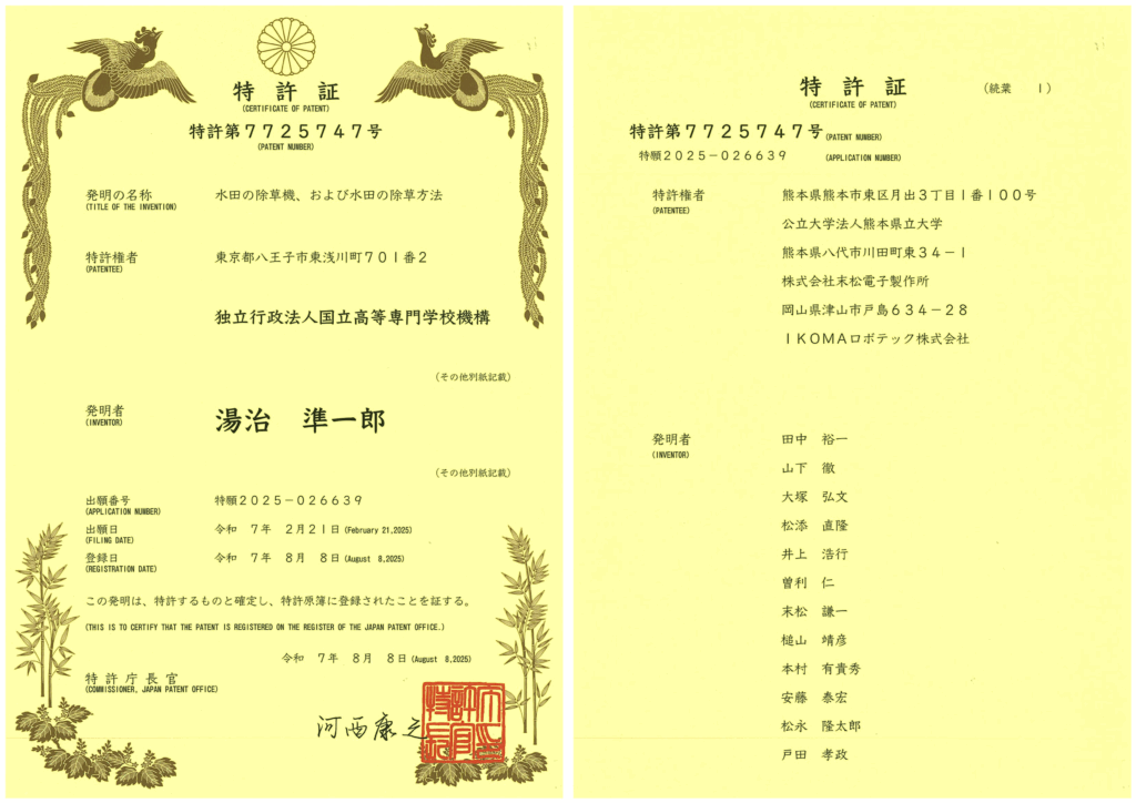 特許権者:独立行政法人国立高等専門学校機構、公立大学法人熊本県立大学、株式会社末松電子製作所、IKOMAロボテック株式会社
