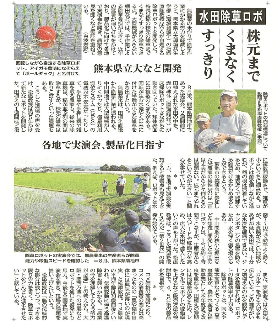 西日本新聞(2025年10月17日付)に水田除草ロボットが紹介されました。